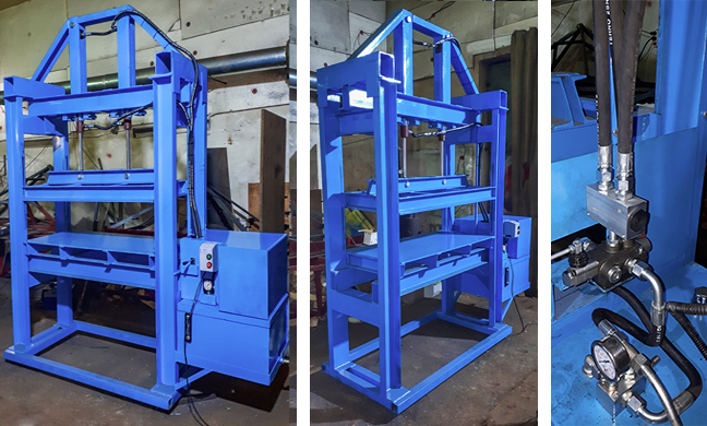 По индивидуальному заказу наши специалисты разработали принципиальную схему и чертеж данного пресса. Работы проводились в несколько этапов - сварка станины, монтаж гидронасосов, сварка емкости для масла, монтаж электропривода и других элементов маслостанции. После окончания основных работ, гидравлический пресс был испытан. Завершающий этап работ - покрытие станины надежной краской для защиты от коррозии и сварка защитного кожуха для маслостанции, от случайных повреждений в ходе эксплуатации.